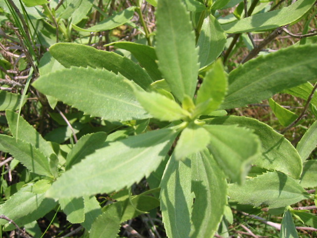A fleshy, sharp toothed plants with opposite leaf branching. Blooms a white or green flower